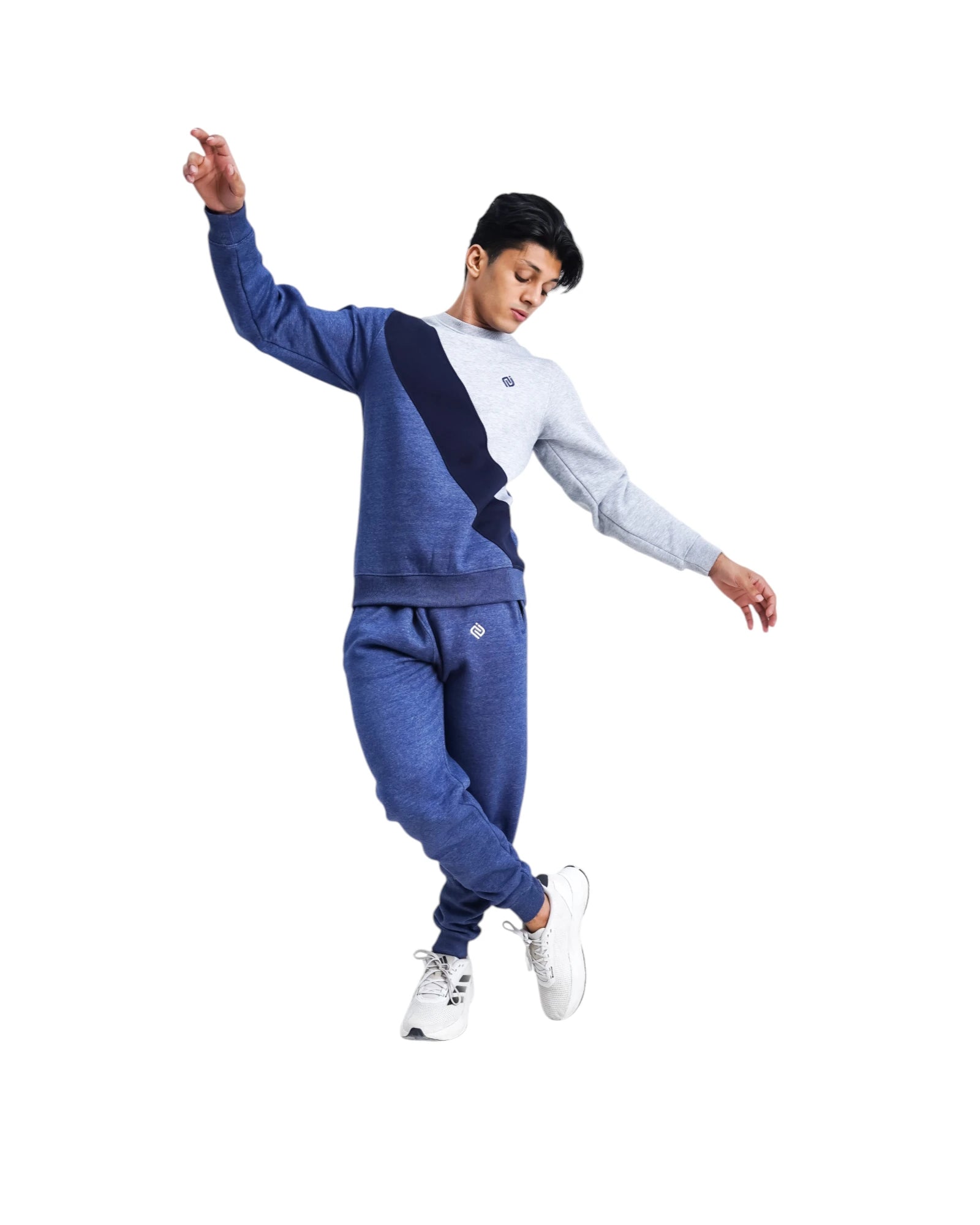 Classic crew-neck sweatshirt paired with matching jogger-style track pants, giving a clean and coordinated winter look.